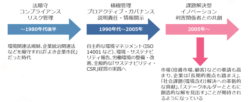 20 世紀後半に、特に公害や地球環境問題が次第にクローズアップされるようになるにつれ、社会が企業に求めることも顕著に変わり始めた。個人的には、1980 年代以降のその変化を、3 つのステ ージに分けて捉えている。この 3 つのステージを体系的に理解することで、ここ 30 年強の環境・CSR・サステナビリティ経営の進化を的確に押さえ、今後にも続く企業経営の潮流を読むことができると考えている。