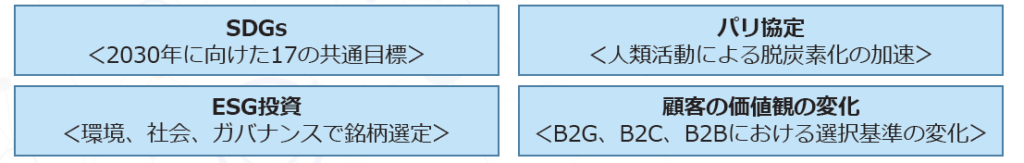 まずは SDGs、ESG 投資、パリ協定、そして顧客の価値観の変化を「社会の変革ドライバー」と捉え、企業経営への本質的な影響を考えてみることにしよう。変革ドライバーとは、社会から企業に対してさらなる経営変革と事業イノベーションを要請する「社会発の推進力」ということを意味している。