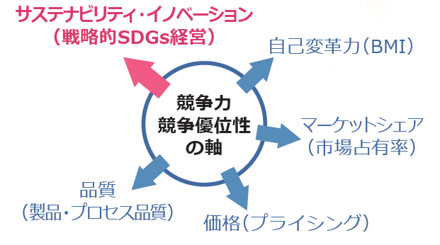 企業は、常に競争にさらされる存在である。そして、時代とともに、競争力を左右する「軸」が変化するのも事実である。20 世紀後半、日本が焼け野原から立ち上がり、大きな自己変革力をもとに、最初は価格で勝負し、その後は、世界市場に出てマーケ ットシェアを獲得し、そして、1960 年代になると、次第に品質経営で世界における確固たる地位を確立していった。この 4 つの要因―「ビジネスモデルを進化しつづける自己変革力」、「マーケットシェア」、「値付け」、そして「プロセスと製品の品質」—は、まさに 20 世紀後半まで、決定的に重要だった「競争軸」と言える。つまり、それらをマスターするか否かが企業の生存可能性に直接影響を与えていた。